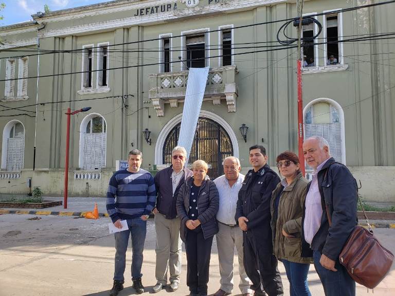 La intendenta Stella Clérici y el responsable de Seguridad Ciudadana Luis Leiva junto al presidente y secretario de la Asociación Cooperadora Policial y el jefe de la URX Claudio Romano recorrieron trabajos de refacción y mejoramiento de la fachada de la Jefatura de Policía y espacios internos.