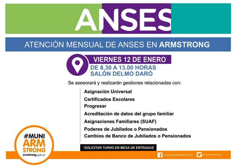 La Administración Nacional de la Seguridad Social (ANSES) y la Municipalidad de Armstrong informan que en el marco de su programa de atención a la comunidad, el día viernes 12 de enero atenderá a los vecinos de nuestra ciudad.
