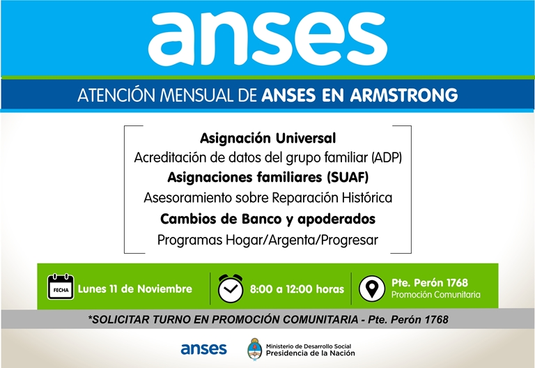 La Administración Nacional de la Seguridad Social (ANSES) y la Municipalidad de Armstrong informan que en el marco de su programa de atención a la comunidad, el día lunes 11 de noviembre, de 8 a 12 hs. atenderá a los vecinos de nuestra ciudad, en la oficina de Promoción Comunitaria, Pte. Perón 1768.