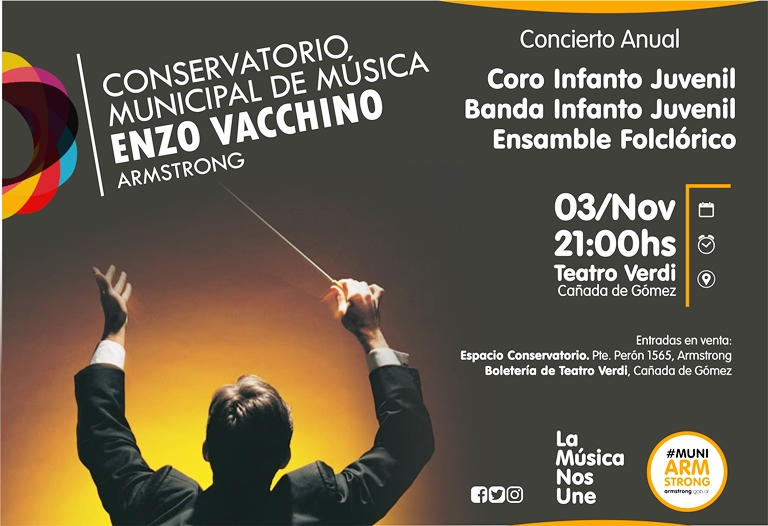 La Municipalidad de Armstrong invita al concierto anual del coro y banda infanto juveniles y Ensamble Folclórico del Conservatorio “Enzo Vacchino” que se realizará el sábado 3 de noviembre a las 21 hs. en el Teatro Verdi, de la ciudad de Cañada de Gómez.