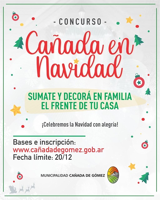 La Municipalidad de Cañada de Gómez invita a participar del concurso “Cañada en Navidad”, con el propósito de promover la creatividad, imaginación y recreación de los cañadenses mediante una propuesta lúdica e interactiva, con las ornamentaciones navideñas. Podrán participar en el concurso personas residentes en Cañada de Gómez, en familia, donde el representante de la decoración sea mayor de edad.