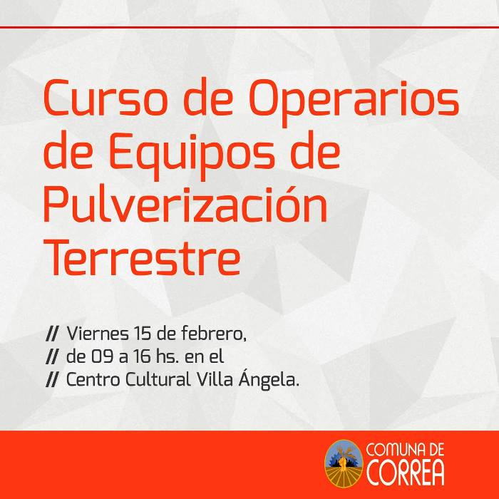 CursoEl próximo viernes 15 de febrero de, de 09 a 16 hs. en el Centro Cultural Villa Ángela, la Comuna de Correa y el Ministerio de Producción del Gobierno de Santa Fe dictarán el Curso de “Operarios de equipos de pulverización terrestre”.