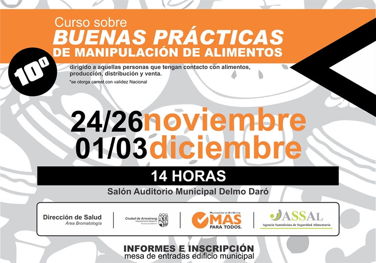 La Dirección de Salud Municipal, a través del área del Área de Bromatología, invita al nuevo curso de buenas prácticas de manipulación de alimentos que se dictará los días 24 y 26 de noviembre, y 1 y 3 de diciembre a las 14 hs., en el salón auditorio Delmo Daró.
