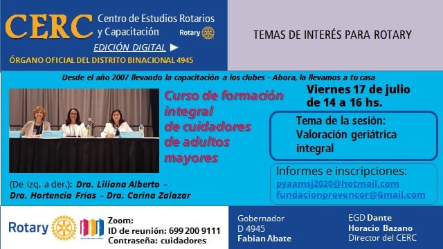 Curso abierto a la comunidad y a todos los Rotarios, será dictado por el grupo de médicas del R.C. de San Justo, quienes gentilmente hacen un gran aporte en la capacitación del distrito, constará con charlas quincenales hasta el mes de diciembre ( 6 meses), donde se entregará certificado habilitante, respaldado por un instituto. Puede ser una buena salida laboral para muchas personas de sus localidades y para muchos rotarios un aprendizaje que podemos aplicar en nuestros mayores de la familia.