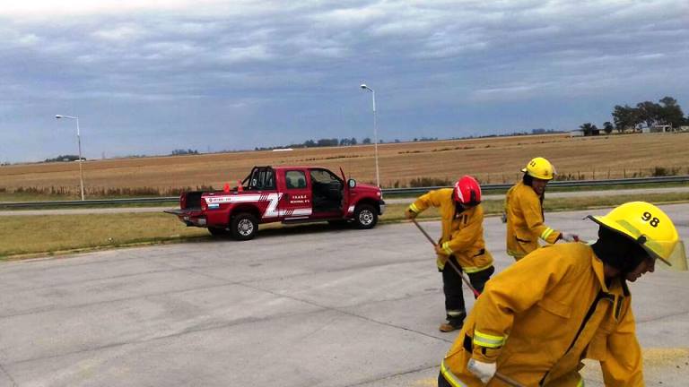 En la mañana de hoy, el grupo de guardia de Bomberos Voluntarios de Armstrong fue convocado a ese sector de la Ruta 15, para realizar tareas de barrido de cereal (soja) por peligrosidad que constituía ese elemento sobre la cinta asfáltica para los vehículos que transitan por ese sector.