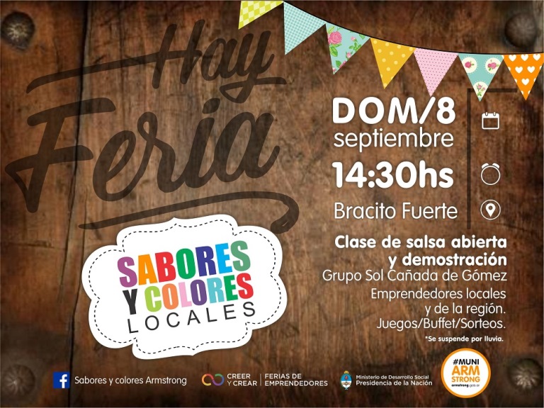 La Municipalidad de Armstrong invita a participar de una nueva tarde de feria junto a los integrantes de Sabores y Colores Locales, el domingo 8 de septiembre desde las 14:30 hs. en el parque recreativo Bracito Fuerte.