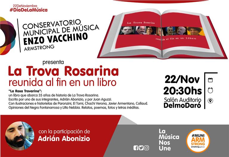 El Conservatorio de Música «Enzo Vacchino» y la Municipalidad de Armstrong invitan a la presentación del libro «La Rosa Trovarina» que se realizará el jueves 22 de noviembre, Día de la Música, a las 20:30 hs. en el salón auditorio Delmo Daró, ubicado en calle San Martín 1565.