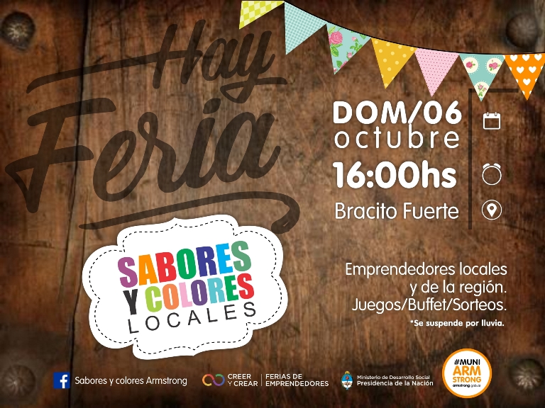 feria 6 octubre 2019 okLa Municipalidad de Armstrong invita a una nueva presentación de la Feria Sabores y Colores Locales, el domingo 6 de octubre desde las 16 hs. en el paseo artesanal del parque recreativo Bracito Fuerte.