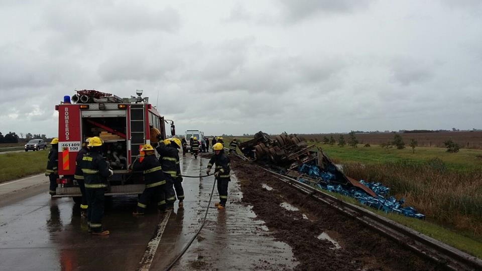 En la tarde de este lunes, a la hora 14,40. La sirena llamó al Cuerpo de Bomberos Voluntarios, por un accidente que se produjo en el Km 387, de la autopista, sentido Rosario- Córdoba (4 Km al oeste del puente de la Ruta 15). El conductor de un camión que transportaba botellas de cerveza, de la empresa Quilmes, pierde el control del rodado, impacta el guarda rail y queda tumbado a un costado de la cinta asfáltica, sin consecuencias físicas para el conductor.