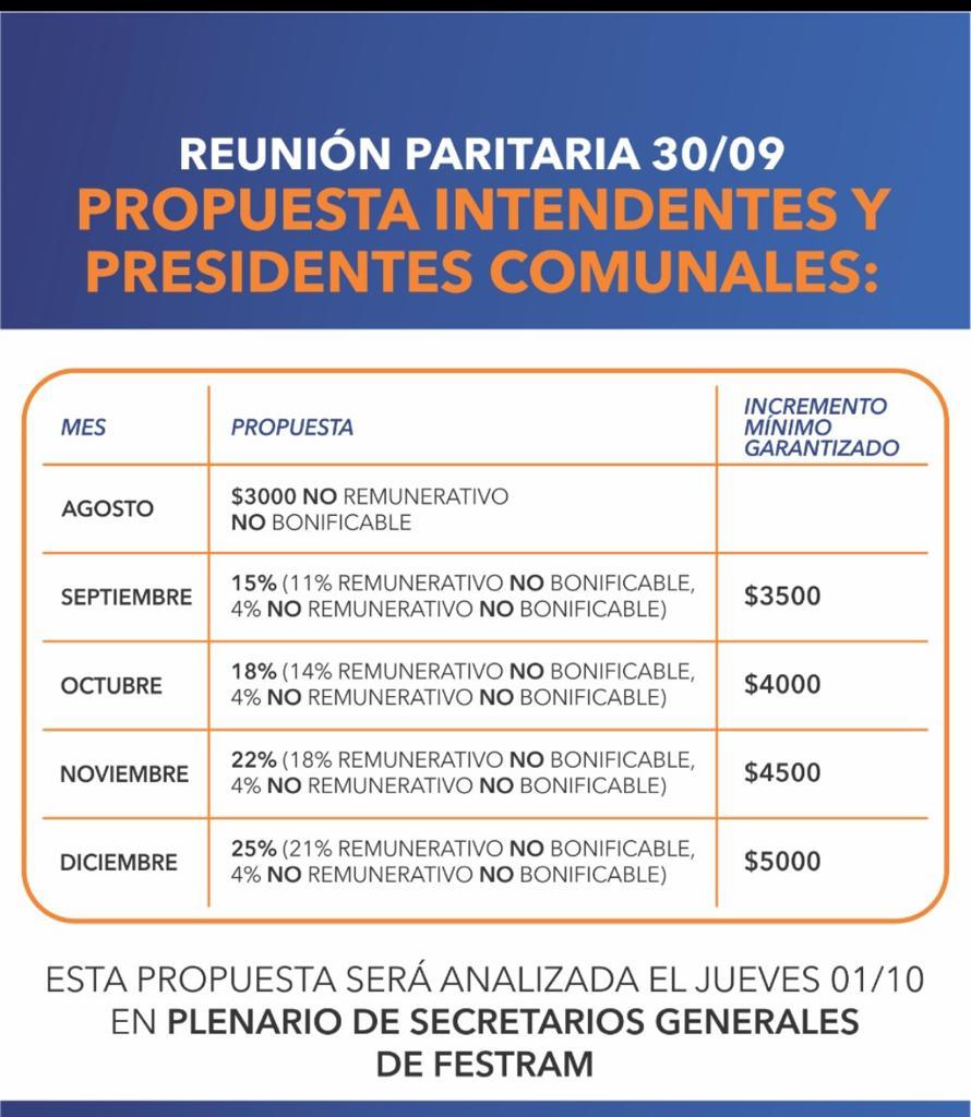 En el marco de las reiteradas reuniones dadas para lograr un acuerdo salarial, los Intendentes y Presidentes de Comunas de la provincia elevaron a FESTRAM la siguiente propuesta, la cual fue rechazada: