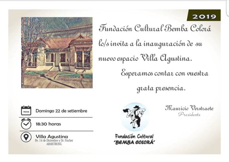 Fundación Bemba Colora inaugura su nuevo espacio «Villa Agustina». Fundación Cultural Bemba Colora invita a la inauguración de su nuevo espacio Villa Agustina.El próximo domingo a las 18,30hs en la intersección de calles Fischer y 14 de diciembre. Fuente Jorge Tagina/ FM Sol 103.1 Web: www.F10WebMedia.com septiembre 19, 2019 by Diario Armstrong 0 comments 4168 viewson Cultura y Humor, Deliberando, Diario Armstrong y Región, Locales, Región Share this post Facebook Twitter Google plus Pinterest Linkedin Mail this article Print this article Tags: Fundación Bemba Colora inaugura su nuevo espacio Villa Agustina. Next: Test vocacional y control sobre el estado del gas envasado. Previous: Lifschitz Rasetto y Drovetta en inauguración de nuevo acceso a Serodino.