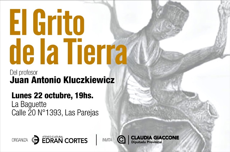 Con la organización del Ateneo Cultural “Edrán Cortés”, y el auspicio de la diputada provincial Claudia Giaccone, este lunes 22 de octubre, a las 19 horas, se presentará en Las Parejas el libro ““El Grito de la Tierra” Arte y Ecología, del profesor Juan Antonio Kluczkiewicz. El encuentro será en La Baguette, calle 20 n° 1393, de esa ciudad.