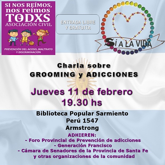 La Agrupación «Sí a la Vida» invita a la charla sobre Grooming y Adicciones, hoy, jueves 11 de febrero a las 19,30hs. el lugar del encuentro será el zoom de la Biblioteca Popular Sarmiento, (Perú 1547).