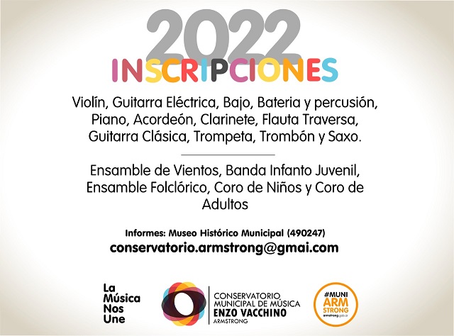 Para informes e inscripción dirigirse a la Dirección de Cultura y Deporte, al Museo Histórico Municipal, o por email escribir a conservatorio.armstrong@gmail.com.