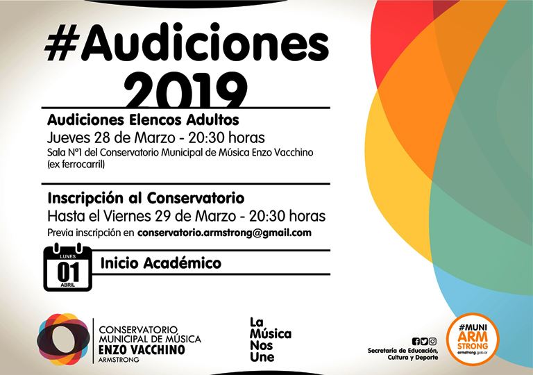 Las audiciones tendrán lugar el día jueves 28 de marzo de 2019, en la Sala Nº1 del Conservatorio Municipal de Música Enzo Vacchino Armstrong (ex ferrocarril),  Armstrong,  Santa Fe, Argentina, a las 20.30 hs, previa inscripción en: conservatorio.armstrong@gmail.com.