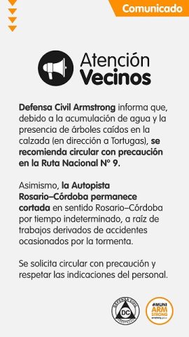 Estado de circulación Actualmente, la Ruta Nacional Nº 9 se encuentra despejada, aunque desde Defensa Civil recomiendan circular con extrema precaución por la zona. En cuanto a la Autopista Rosario-Córdoba, el tránsito permanece cortado desde la Ruta 15 en sentido hacia Córdoba debido a las tareas de remoción y peritajes.