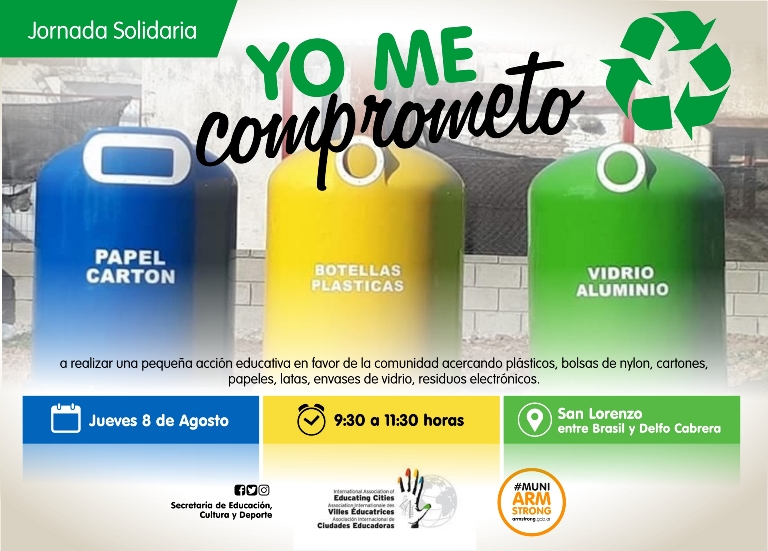 La Municipalidad de Armstrong invita a la segunda jornada solidaria “Yo me Comprometo”, el jueves 8 de agosto de 9:30 a 11:30 hs. en calle San Lorenzo, entre Brasil y Delfo Cabrera. En esta oportunidad, se propone acercar botellas de plástico, bolsas de nylon, cartones, papeles, latas, botellas, envases de vidrio y residuos electrónicos.