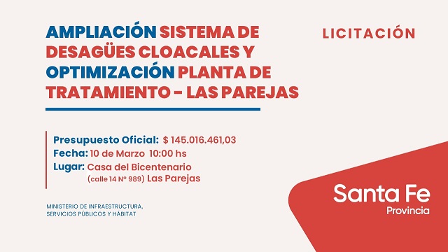 El Ministerio de Infraestructura, Servicios Públicos y Hábitat, a través de la Secretaría de Empresas y Servicios Públicos, llevará adelante la licitación para las obras de saneamiento para la ciudad de Las Parejas con un presupuesto oficial superior a 145 millones de pesos. Estos trabajos permitirán la ampliación del sistema de desagües cloacales y la optimización de la planta de líquidos cloacales, permitiendo incorporar a las redes domiciliarias a más 3000 ciudadanos de Las Parejas.