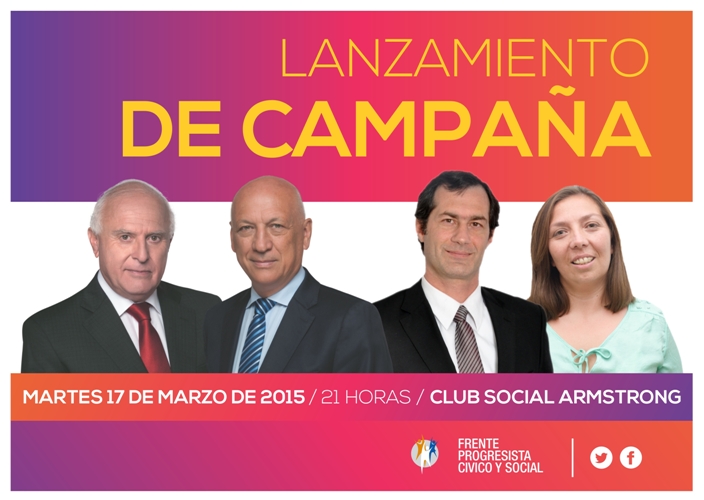 El Frente Progresista Cívico y Social de Armstrong, invita a la población al acto de lanzamiento de sus pre candidatos a Gobernador, Senador y Concejal , a realizarse el día Martes a las 21 hs. en el Salón del Club Social. Se contará con la presencia de la formula de Miguel Lifschtz y Carlos Fascendini, el Dr. Pablo Verdecchia y Daniela Pérez.