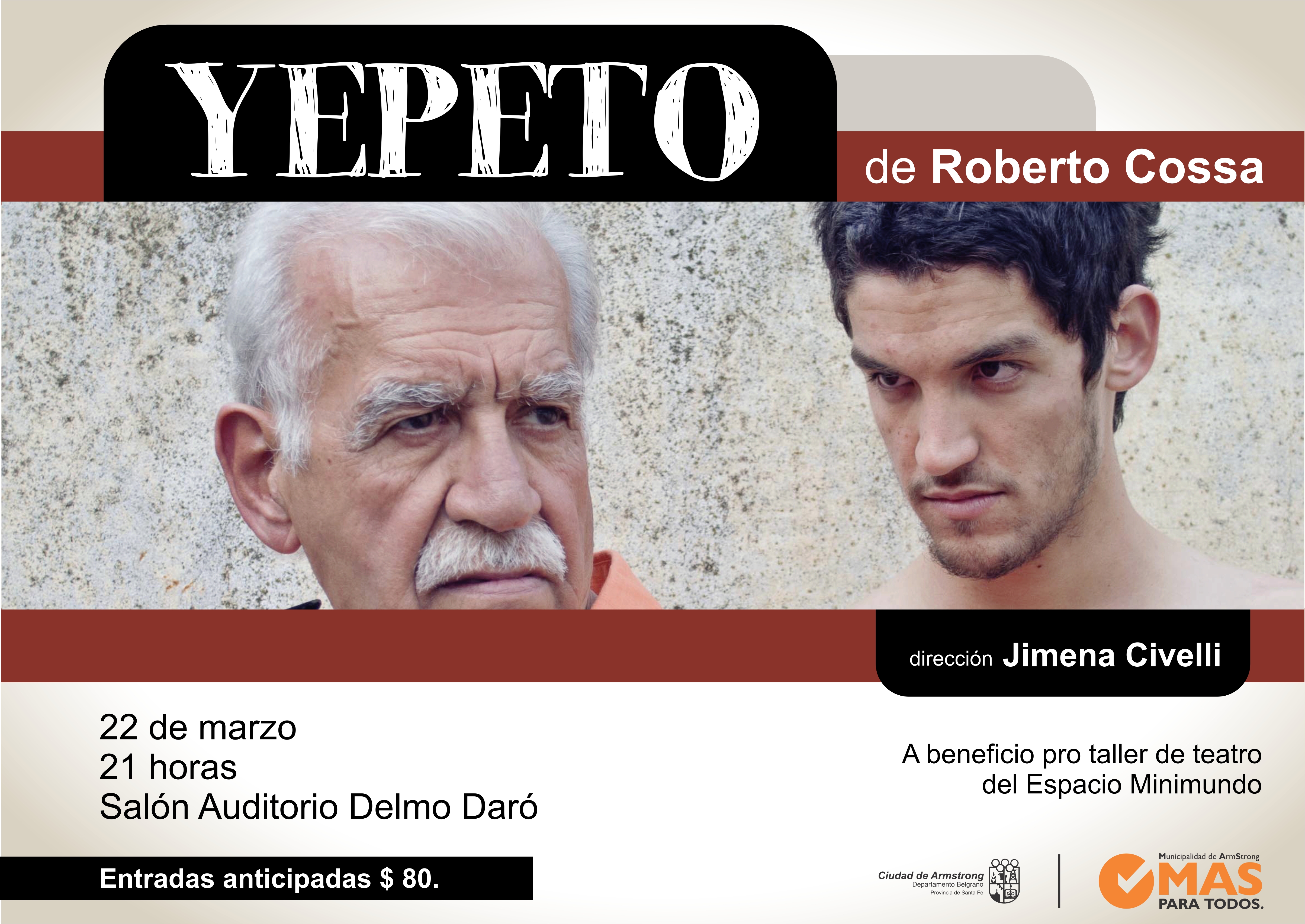 placa yepetoLa Municipalidad de Armstrong invita a asistir a la función de la obra teatral “Yepeto” que se ofrecerá el día martes 22 de marzo a las 21 hs. en el salón auditorio Delmo Daró y a beneficio del taller de teatro del Espacio Minimundo.