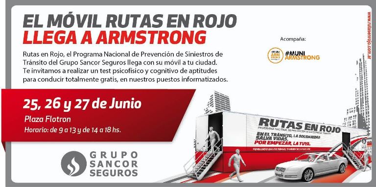 Sancor Seguros y Municipalidad de Armstrong, invitan a toda la comunidad armstronense a participar de la Jornada del Programa Nacional de Prevención de Siniestros con el móvil de Rutas en Rojo que se realizará desde lunes 25 de junio al miércoles 27, en Plaza Flotron