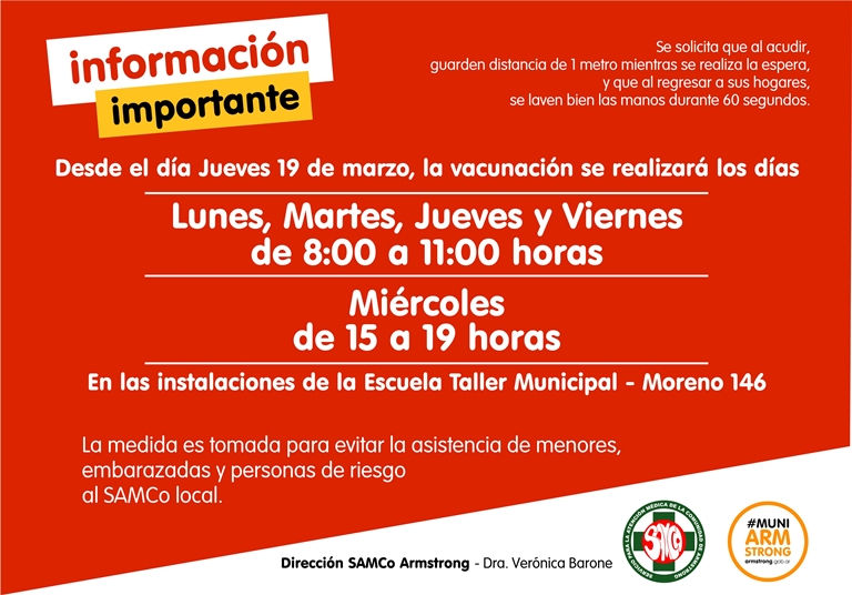 Nuevo horario y lugar de vacunación. Web: www.F10WebMedia.com marzo 18, 2020 by Diario Armstrong 0 comments 908 viewson Deliberando, Diario Armstrong y Región, Locales, Prevención y Salud Share this post Facebook Twitter Google plus Pinterest Linkedin Mail this article Print this article Next: Clerici firmo convenio «Argentina Crece». Previous: Medidas en todo el Departamento Belgrano por Coronavirus.