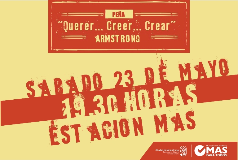La Municipalidad de Armstrong invita a toda la comunidad a asistir a la peña del programa provincial denominado Querer Creer Crear que se realizará el sábado 23 de mayo a partir de las 19:30 hs. en la Estación Más, con entrada libre y gratuita.