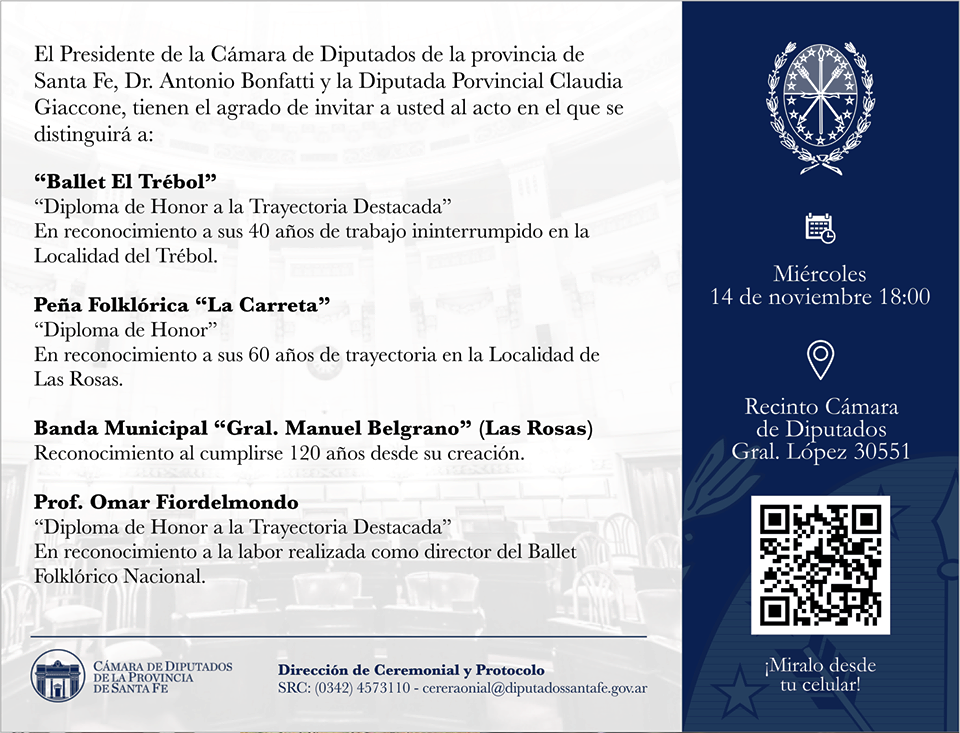 La Legislatura reconocerá por su trayectoria a Peña La Carreta y la Banda Municipal de Música «Gral. Belgrano», ambas de Las Rosas. También lo será el Ballet El Trébol –de la ciudad del mismo nombre- , y el Maestro Omar Fiordelmondo.