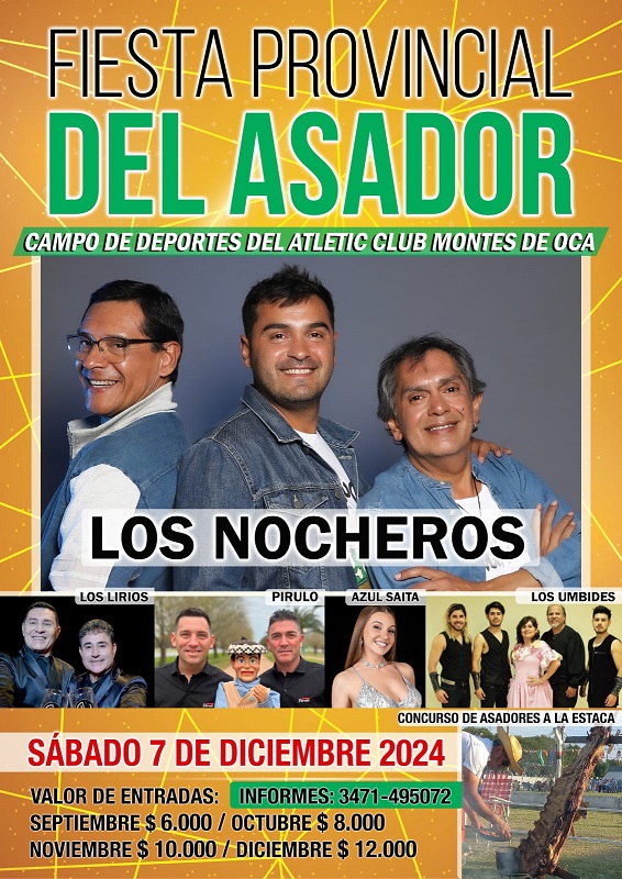 la particularidad que estará recorriendo el sector de asadores a partir de las 18:30 hs donde el público lo podrá ver de cerca y sacarse fotos con el); A las 24 hs estará el show de LOS LIRIOS para hacer bailar a todos los presentes y el gran cierre de una jornada hermosa con el show de LOS NOCHEROS, repasando su gran repertorio de temas clásicos.