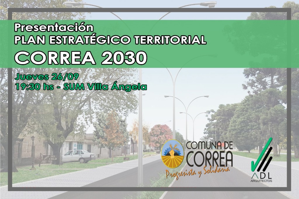 El próximo jueves 26 de septiembres, a las 19.30 hs. en el Centro Cultural Villa Angela, la Comuna de Correa realizará la presentación del Plan Estratégico Territorial, Correa 2030.