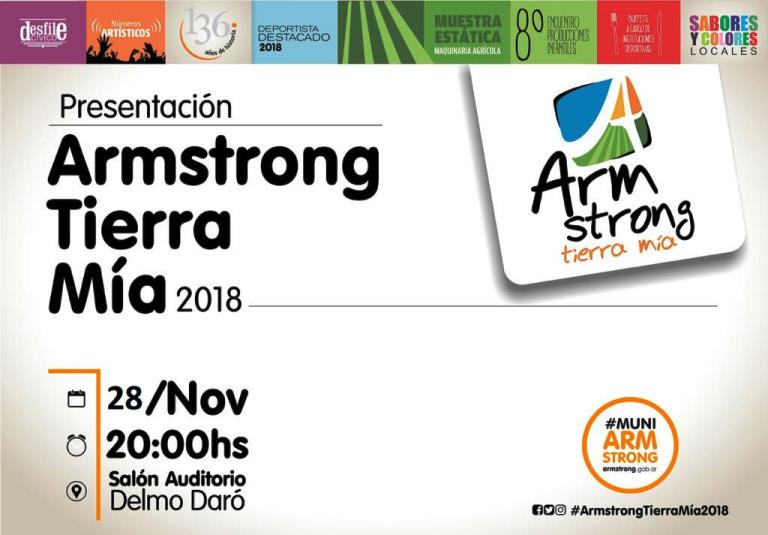 La Municipalidad de Armstrong invita a toda la comunidad a la presentación oficial de la fiesta “Armstrong Tierra Mía” con motivo de los 136 años que cumplirá nuestra ciudad el próximo 14 de diciembre.