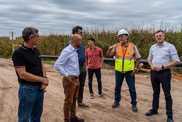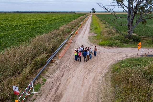 El senador provincial Pablo Verdecchia recorrió la obra del Gasoducto Ruta 20 junto al presidente de ENERFE, Rodolfo Giacosa, el ministro de Desarrollo Productivo de la provincia, Gustavo Puccini, el presidente comunal de Montes de Oca, Emanuel Sagripanti, y autoridades de la Comuna de Tortugas en una visita realizada en la zona rural comprendida entre Tortugas y Montes de Oca.