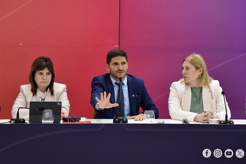 El gobernador Maximiliano Pullaro y los ministros nacionales de Seguridad, Patricia Bullrich y de Defensa, Luis Petri, brindaron una conferencia de prensa en la sede del gobierno de la provincia en Rosario, para brindar detalles acerca de las medidas de seguridad que se tomarán para hacer frente a los hechos de violencia que está viviendo la ciudad. Estuvieron acompañados de la vicegobernadora, Gisela Scaglia; el ministro de Justicia y Seguridad provincial, Pablo Cococcioni y la fiscal general del Ministerio Público de la Acusación. María Cecilia Vranicich.