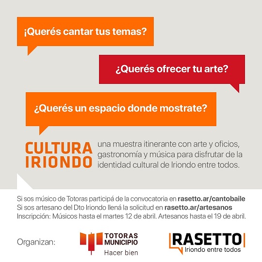 Para este primer encuentro, podrán anotarse los músicos, cantantes y bailarines de la ciudad de Totoras que quieran participar mediante el siguiente link: www.rasetto.ar/cantobaile, hay tiempo para anotarse hasta el martes 12 de abril.