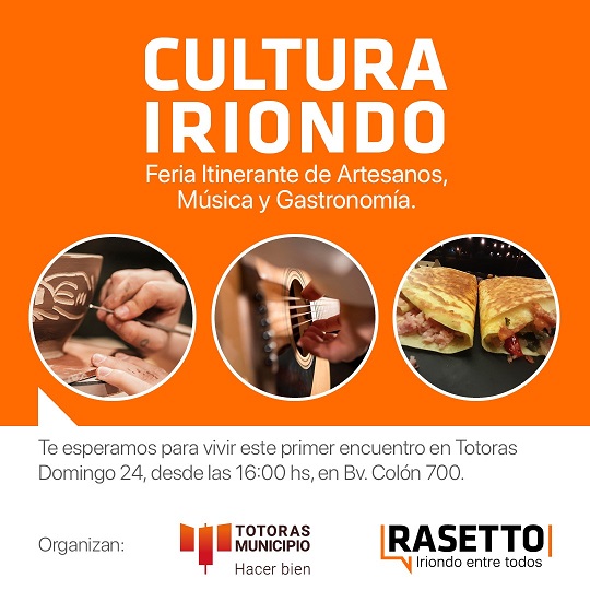 El Senador Hugo Jesús Rasetto y la Intendente Guadalupe Lanatti invitan a la primer parada de “Cultura Iriondo”, la Feria Itinerante de Artesanos, Música y Gastronomía que recorrerá el Departamento Iriondo. La misma se llevará a cabo en la localidad de Totoras el domingo 24 de abril a las 16 Hs. en el albergue municipal para delegaciones e irá recorriendo las 12 localidades del departamento durante todo el año. Este primer encuentro está organizado de manera conjunta por el Municipio de Totoras y el Senador Hugo Rasetto.