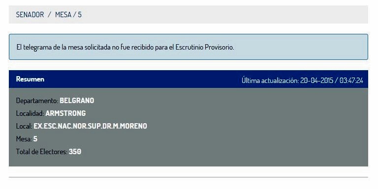 De Pablo Verdecchia. El actual intendente de Armstrong expresó en Contacto FM que, tal como puede verse en la misma página del Tribunal Electoral (foto), las mesas 4, 5, 6 y 7 de esa ciudad no fueron cargadas en el escrutinio provisorio. En ellas estarían los votos que lo hacen ganador de la interna para senador.