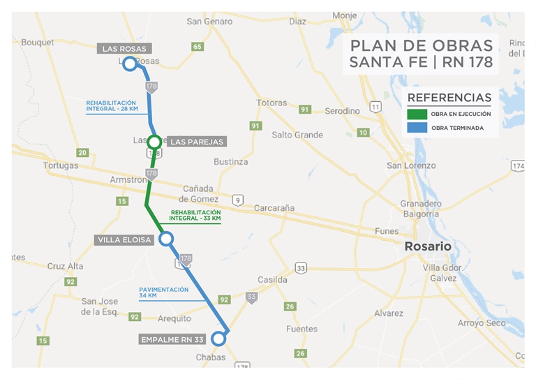 Durante los últimos tres años y medio, el Gobierno Nacional invirtió $650 millones en obras para mejorar la conexión a través de la ruta 178. A principios de 2017 culminó la pavimentación del último tramo de tierra del corredor (34 km) -pendiente desde 1960- y en 2018 finalizó la rehabilitación integral de 28 km entre Las Rosas y Las Parejas.