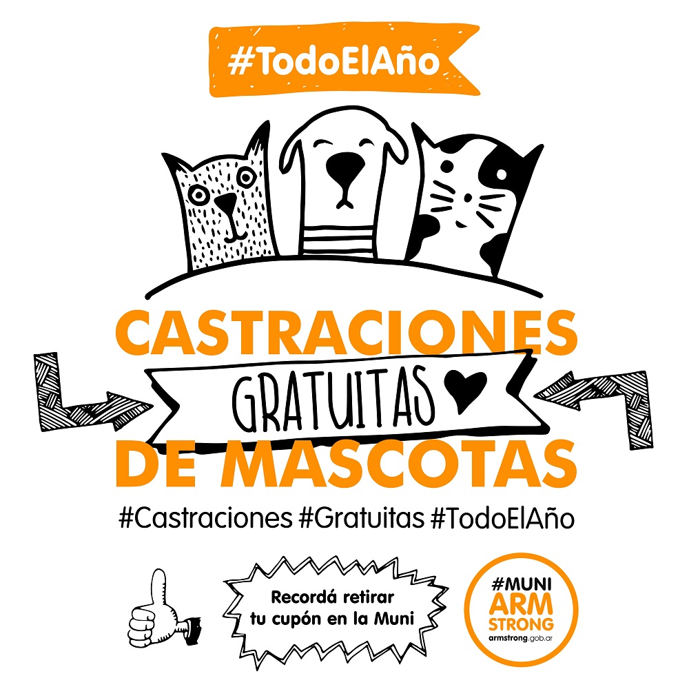 El municipio realiza castraciones gratuitas todo el año, a través de los distintos profesionales de la ciudad. Llegate al municipio y retirá la autorización de lunes a viernes de 7 a 13 hs en mesa de entrada.