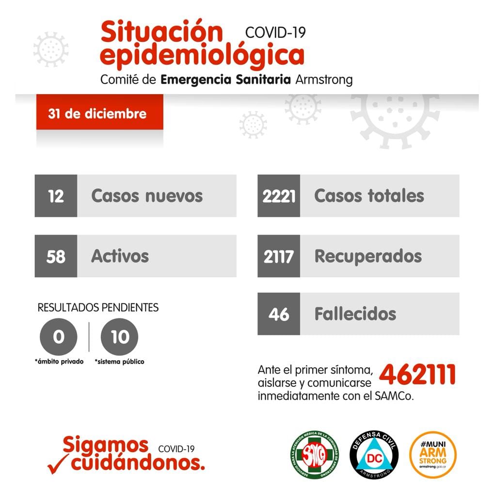 Situación Epidemiológica de Armstrong. 12 casos nuevos. Web: www.F10WebMedia.com enero 3, 2022 by Diario Armstrong 0 comments 769 viewson Deliberando, Diario Armstrong y Región, Locales, Prevención y Salud, Región Share this post Facebook Twitter Google plus Pinterest Linkedin Mail this article Print this article Next: Stella Clérici informó que dio positivo de Covid-19. Previous: Cornaglia finaliza el año con trabajo legislativo sólido en materia de salud y seguridad.