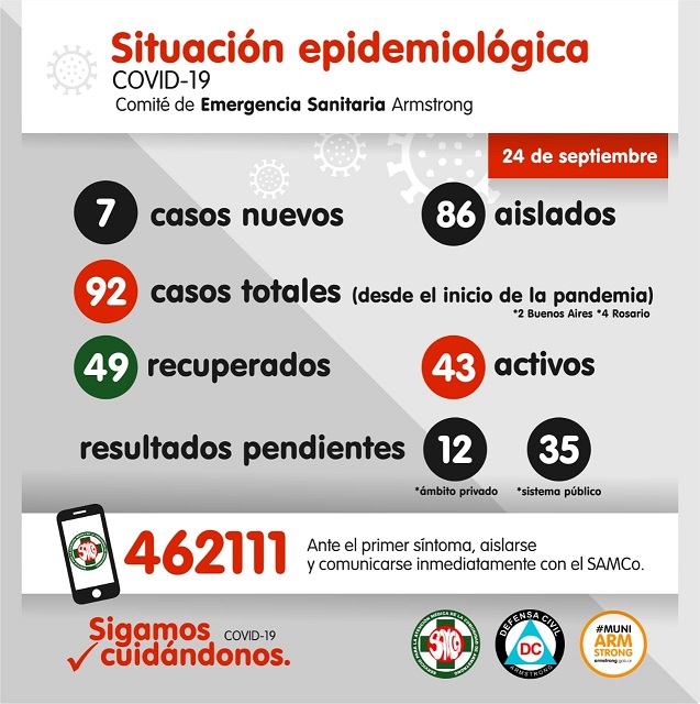 Situación Epidemiológica de Armstrong. Jueves 24 de Septiembre. Hoy reportamos 7 nuevos casos, y 5 altas. Hisopados pendientes, 12 del ámbito privado y 35 del sector público. Recordamos que ante la aparición de síntomas autoaislarse y consultar a su médico, o llamar al SAMCO 462111. Web: www.F10WebMedia.com septiembre 25, 2020 by Diario Armstrong 0 comments 948 viewson Deliberando, Diario Armstrong y Región, Locales, Prevención y Salud Share this post Facebook Twitter Google plus Pinterest Linkedin Mail this article Print this article Next: Clerici recorrió avances en pavimento de calle Capdevila. Previous: Situación Epidemiología de Armstrong. Miércoles 23 de Septiembre.