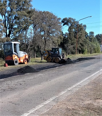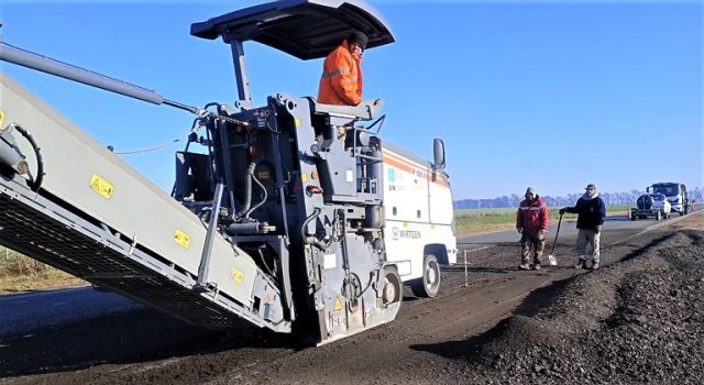Un grupo de trabajadores viales realiza el fresado y repavimentación por tramos en la zona norte de Villa Eloísa. La segunda cuadrilla ejecuta reparaciones en la travesía urbana de RN 178 en Las Rosas. Colaboran en el ordenamiento de la circulación los estados locales con su policía de tránsito.